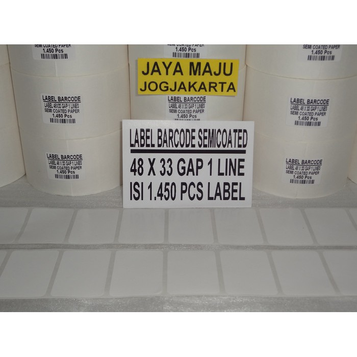 LABEL BARCODE SEMICOATED 48 X 33 (LEBAR 48 MM TINGGI 33 MM) 1 LINE GAP CORE 1" (25,4 MM) ISI 1.450 PCS LABEL umumnya digunakan untuk Printer Barcode Jenis DESKTOP (Kecil).