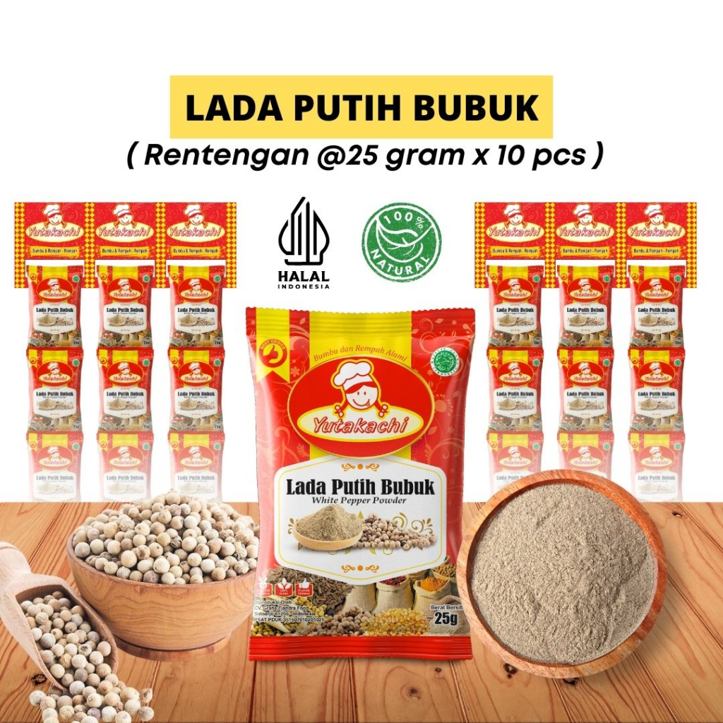 Lada putih bubuk "yutakachi" merupakah lada putih yang diolah dari biji lada putih berkualitas dan murni tanpa campuran, sehingga menghasilkan aroma dan rasa yang sangat kual. Sangat cocok sebagai bumbu rempah dasar pada aneka macam makanan.