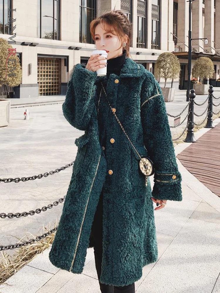 LANMREM Женское зимнее Новое темно-зеленое пальто из овечьей шерсти с длинными рукавами однобортное свободное роскошное теплое пальто в Корей...
