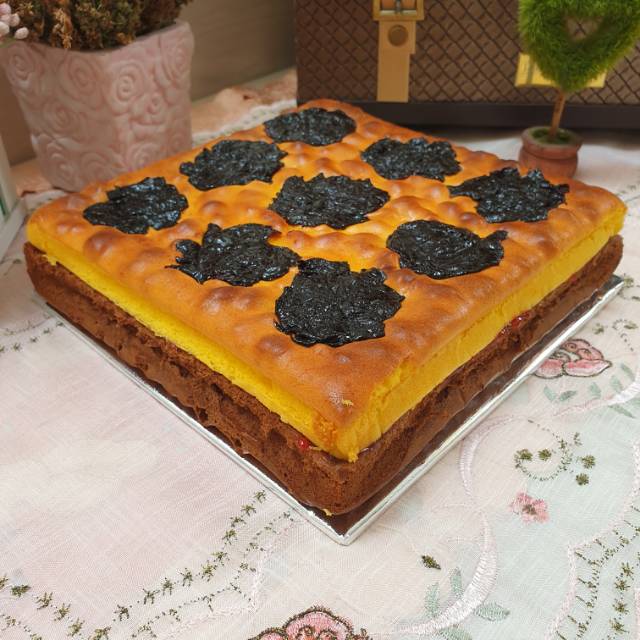 ❤2 lapis dan bagian tengahnya menggunakan selai stroberi dan topping prunes