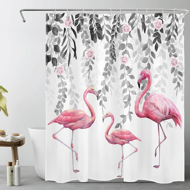 LB Розовый Фламинго Шторка для Душа Серый Лист Розовый Роза Цветочные Шторки для Душа для Ванной Комнаты Тропическая Птица Набор Шторки для Душа Водонепроницаемая Моющаяся Ткань 47 W x 68 L (Pack of 1) серый