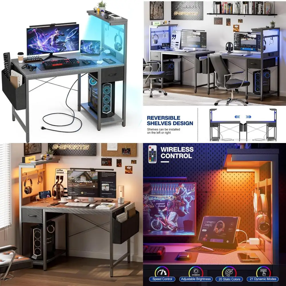 LED-Illuminated 47 Inch Gaming Desk with Power Outlet, Reversible Shelves and Storage Drawer for PC, Compact Computer Desk with