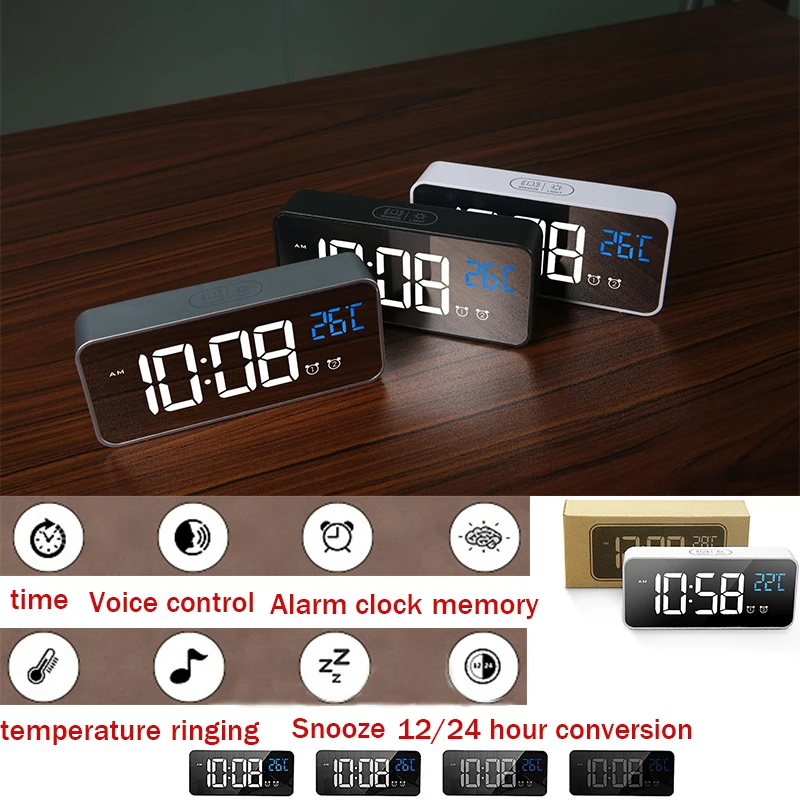 LED Mirror Alarm Clock Voice Control Multi-function Digital Snooze Table Clock Wake Temperature Display Home Decoration Clock