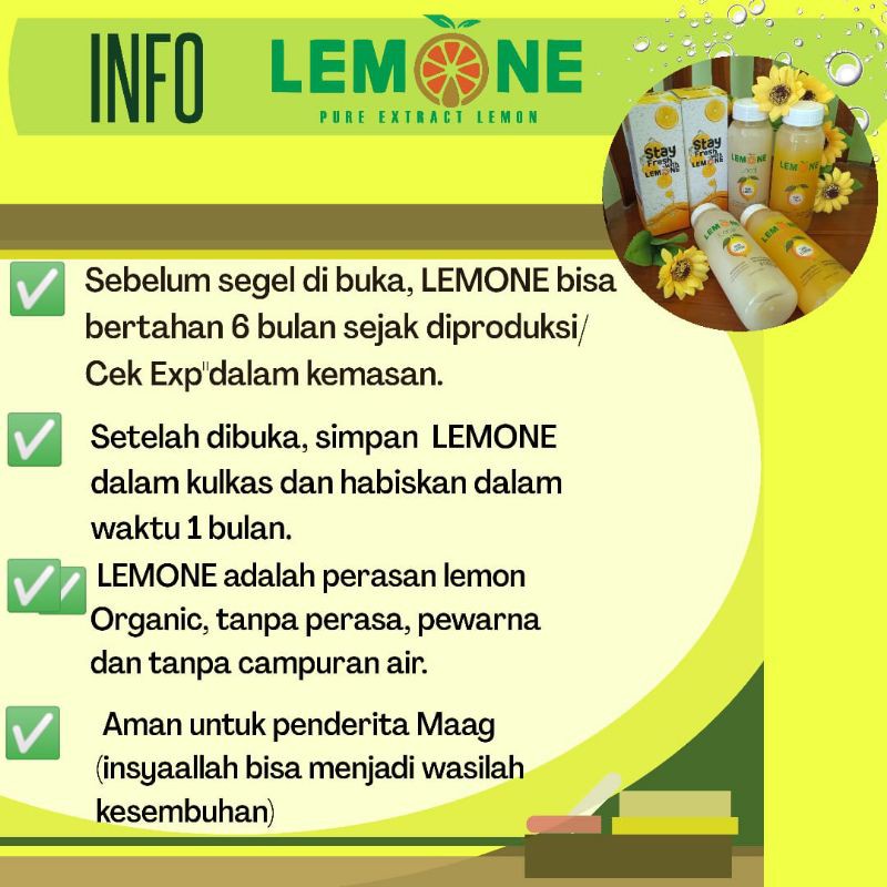 LEMONE adalah perasan buah jeruk lemon Organik, tanpa pewarna, tanpa perasa, dan tanpa campuran air. LEMONE hadir dalam kemasan 250ml. Sari dari buah jeruk lemon organik aman untuk dikonsumsi oleh penderita Maag (InsyaALLAH bisa menjadi wasilah kesembuhan).