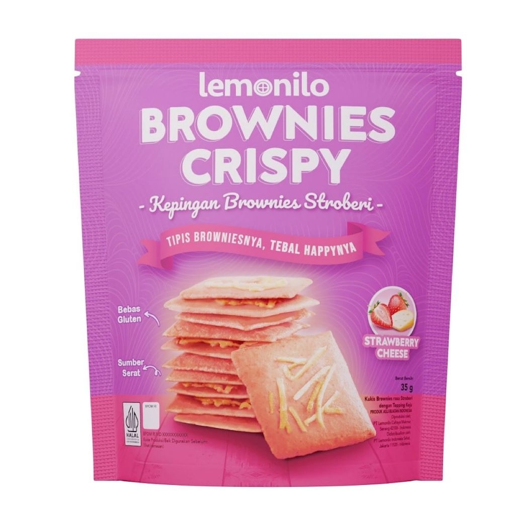 Lemonilo Brownies Crispy adalah camilan brownies tipis dalam bentuk kepingan renyah yang terbuat dari tepung singkong berkualitas, dengan pilihan rasa seperti cokelat, keju, dan stroberi. Brownies ini dirancang sebagai pilihan camilan sehat karena rendah gluten, rendah kalori, dan tinggi serat, serta dibuat tanpa bahan pengawet, pewarna, dan pemanis buatan.