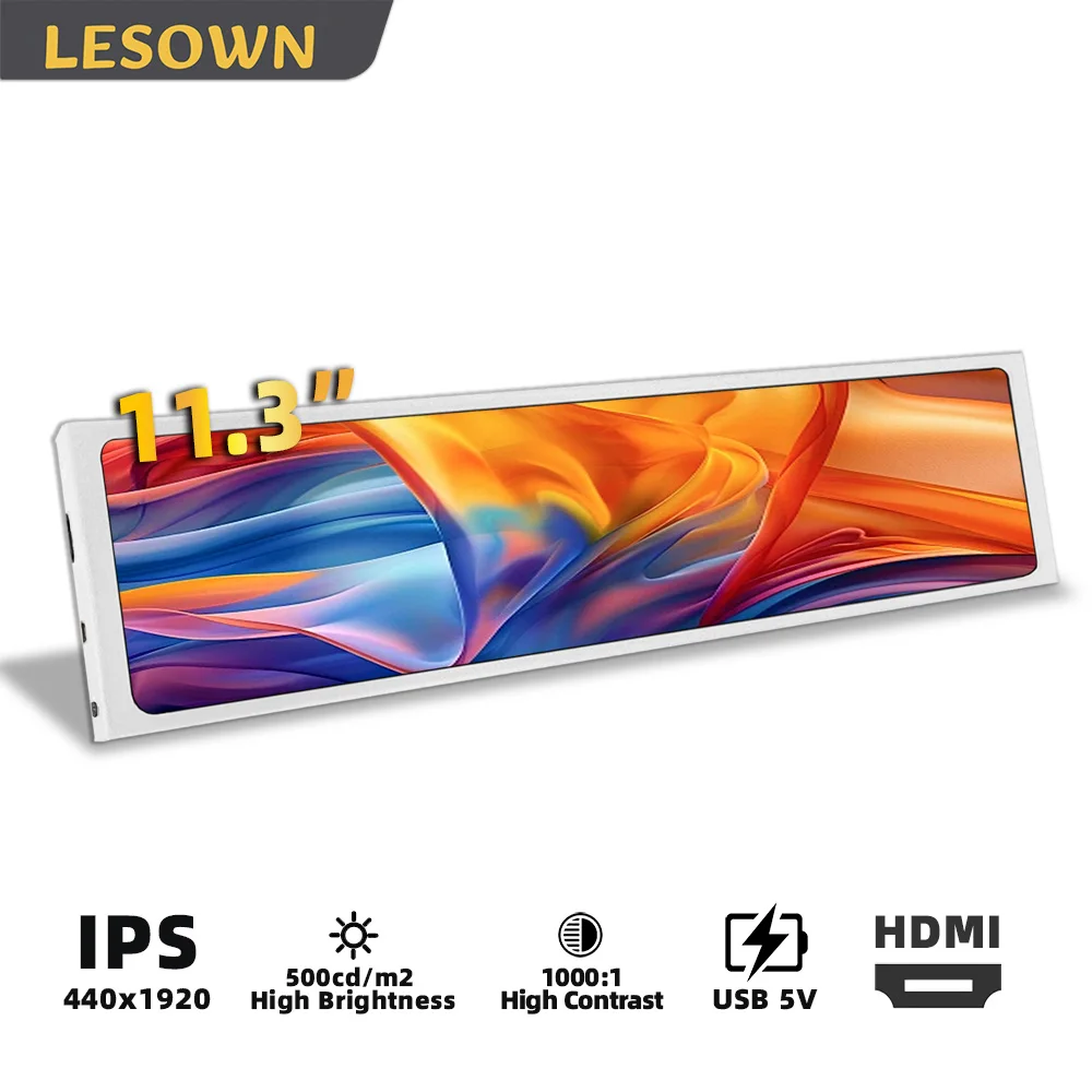 LESOWN Small 11.3 Inch Stretched Bar Monitor 440x1920 IPS LCD Mini Side Display PC Case Monitor for Laptop PC Driver-Free Setup