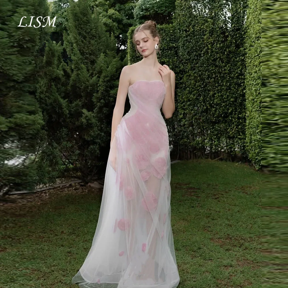 LIAM Розовые цветы Вечерние платья трапециевидной формы без бретелек Длинные платья для выпускного вечера из шелкового тюля Элегантные вечерние платья по индивидуальному заказу