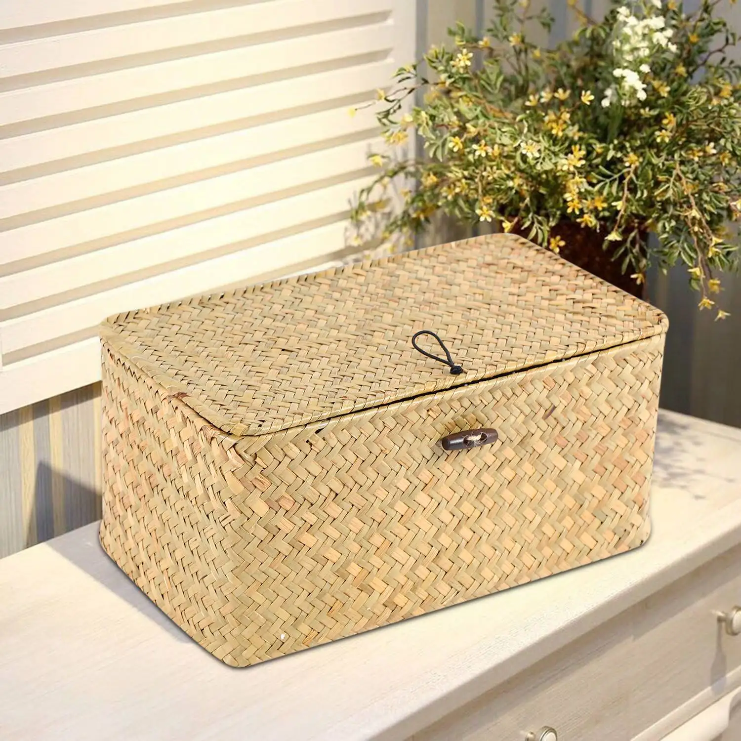 LLCS-Соломенная плетеная корзина ручной работы с крышкой, органайзер для макияжа, ящик для хранения, корзины для белья из морских водорослей, шкатулка для драгоценностей из ротанга