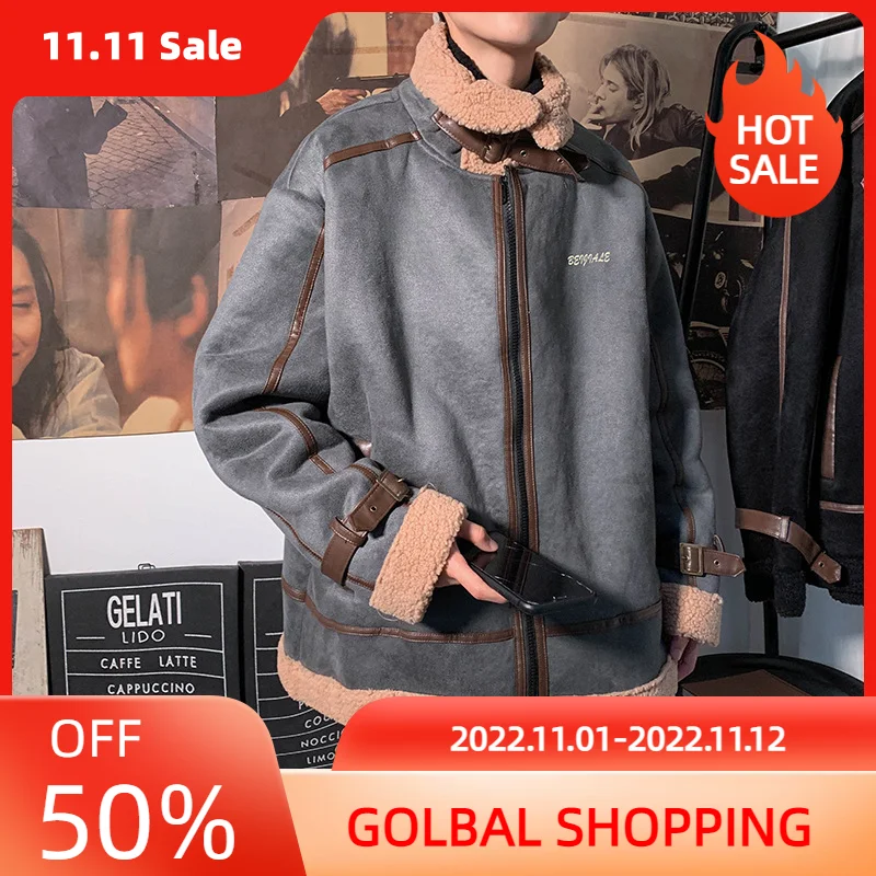 LUCLESAM мужская куртка-карго из ягненка с отворотом толстая пуховая куртка на молнии с цветными блоками зимняя винтажная Корейская версия сво...