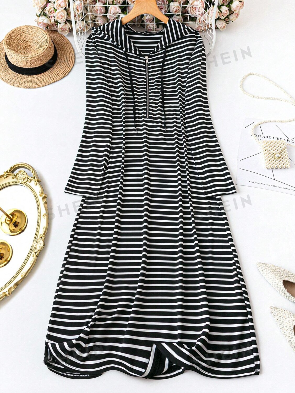 LUNE Летнее платье больших размеров с капюшоном и Длинными рукавами с принтом, завязывающимся воротником и карманами Shein, черный
