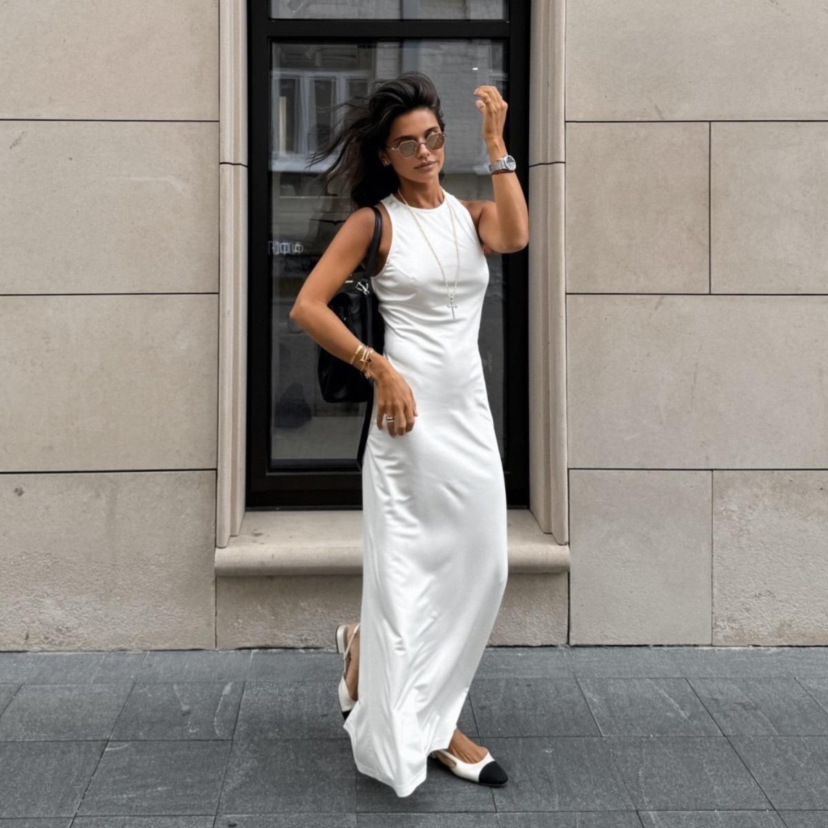 LYRIA Женское элегантное сексуальное французское бальное платье Длинное белое платье Женское платье с О-образным вырезом без рукавов Женщины L белый