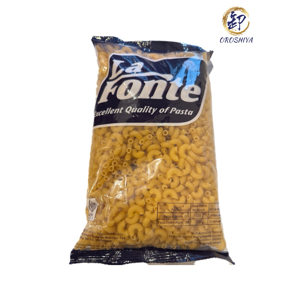 pasta berbentuk pendek (short pasta) dengan permukaan bertekstur.