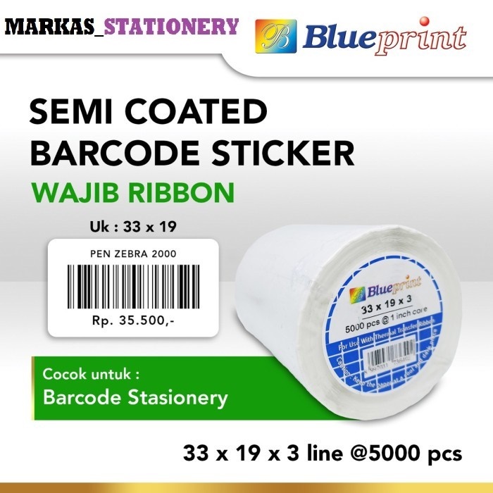 Sticker label Barcode 33x19mm 3 Line Semi Coated BLUEPRINT Core 1" isi 5000 Pcs