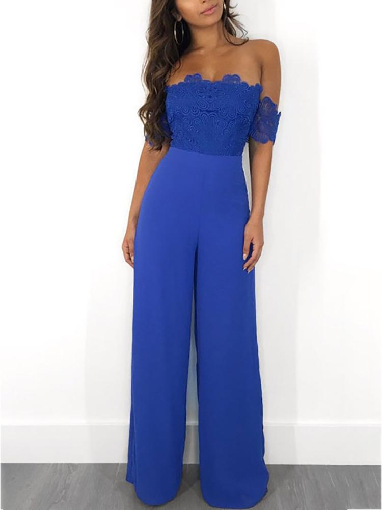 Lace Splicing Off Shoulder Wide Leg Jumpsuits, Blue