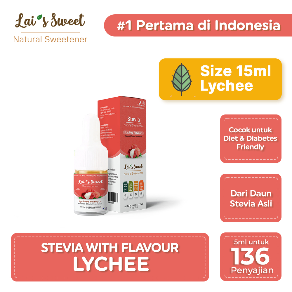Lai's Sweet Stavia Cair Rasa Lychee adalah pemanis alami cair berasa Lychee rasa asli Indonesia yang menggunakan daun Stevia dan extract Perasa Hazelnut sebagai bahan utama. Dikenal sebagai pemanis dengan 200 kali lebih manis dari gula, daun Stevia adalah salah satu pemanis alami terbaik yang digunakan orang di seluruh dunia.