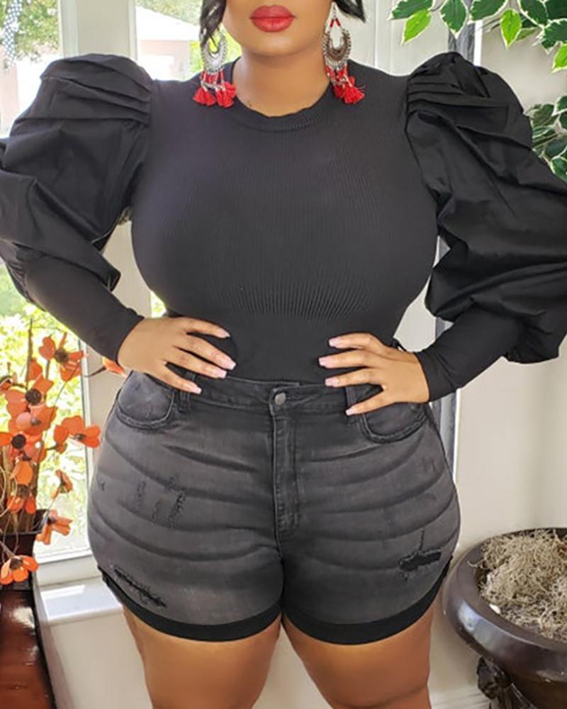 Lantern Sleeve Ruched Ribbed Top, Black
