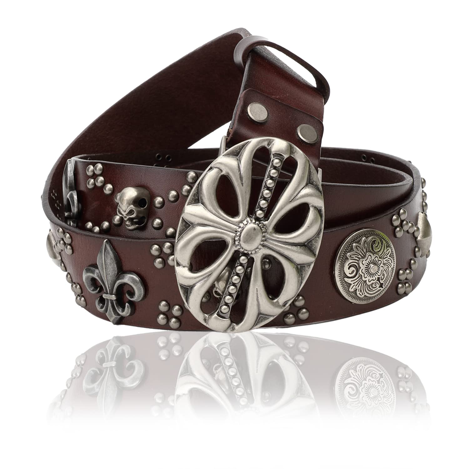 Laquest Ремень из коровьей кожи с большой пряжкой с лилией и ирисом и рельефным дизайном, мужской, с шипами, эмблема, (Темно коричневый)