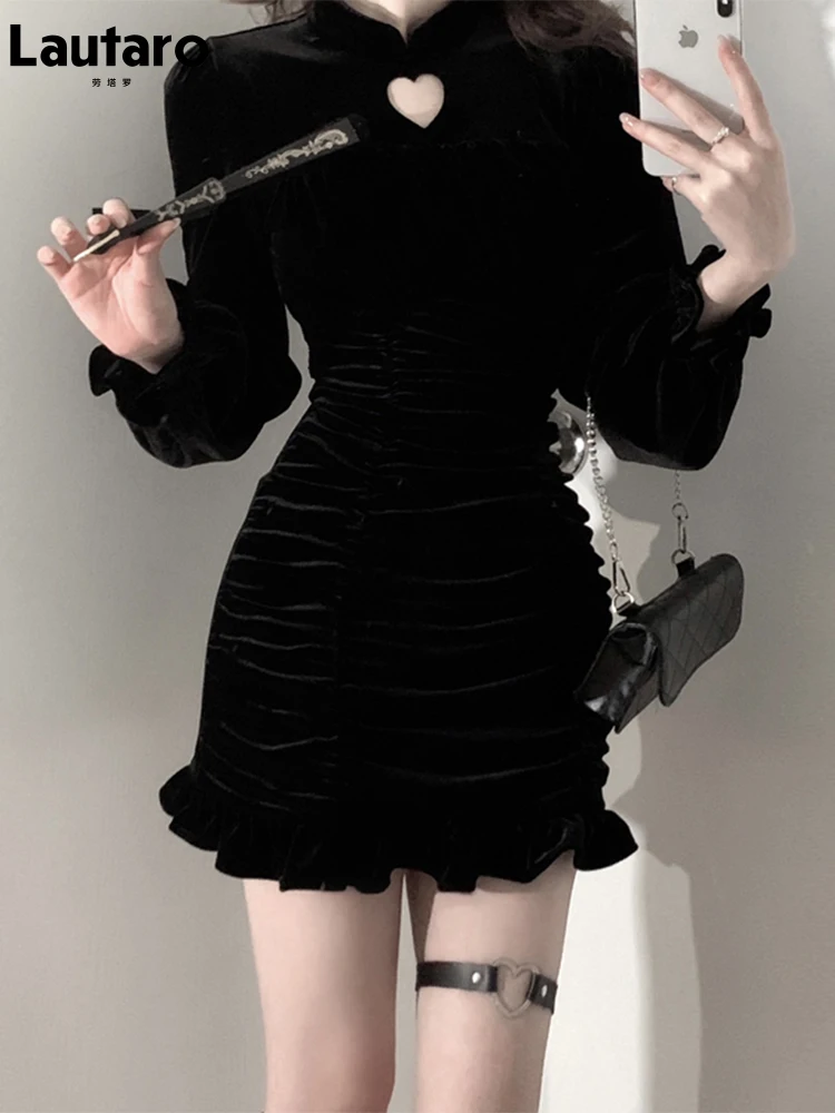 Lautaro Весеннее черное эластичное мягкое бархатное мини-платье с вырезом для вечеринки с длинным рукавом-фонариком Осенняя одежда 2022 с рюшами...