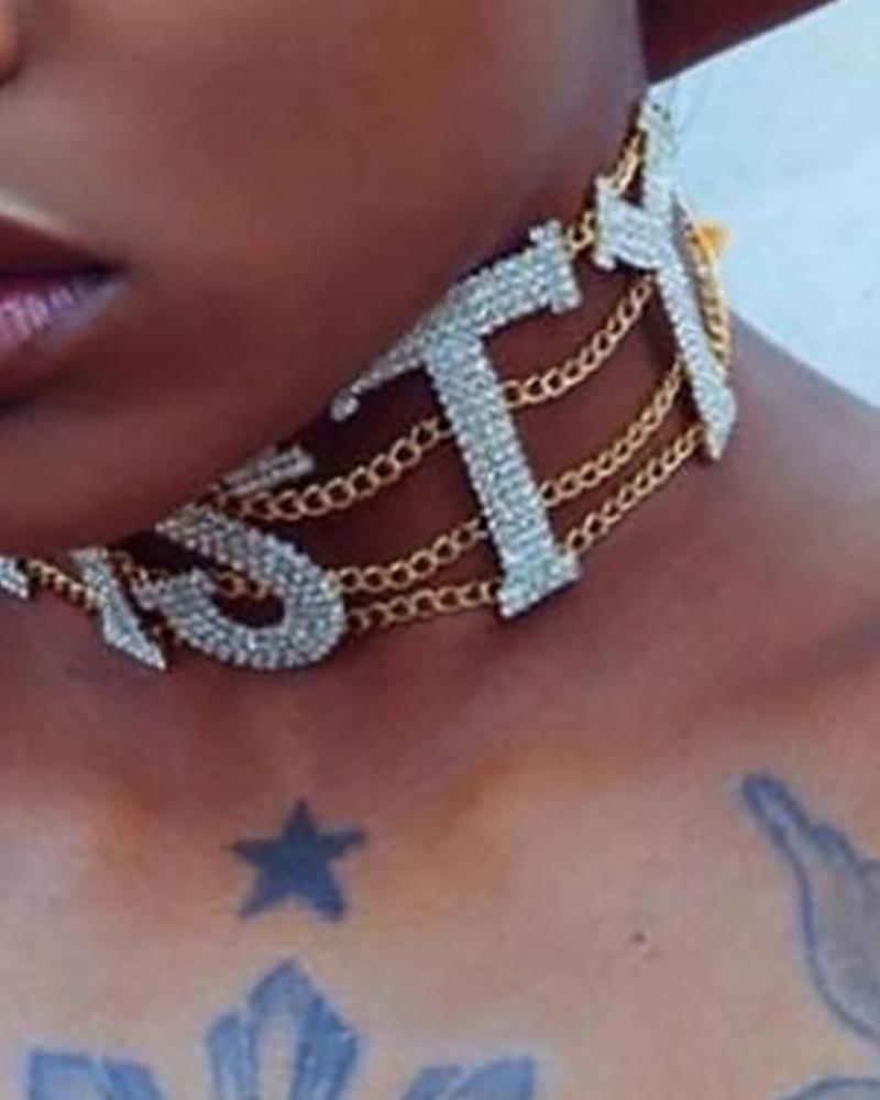 Layered Chain Letter Pattern Rhinestone Choker, Gold