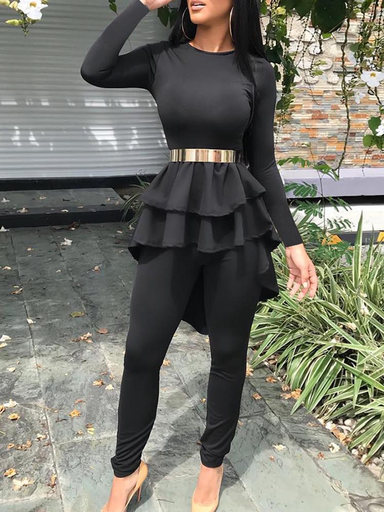 Layered Ruffles Dip Hem Top & Pants Set, Black