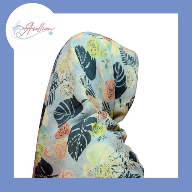 Hijab dengan motif daun dan perpaduan warna yang indah ketika dipakai dipadukan dengan bahan potton yang ringan dan tidak mudah kusut
