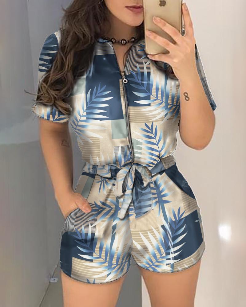 Leaf Print Pocket Design Drawstring Rompers, Multicolor
