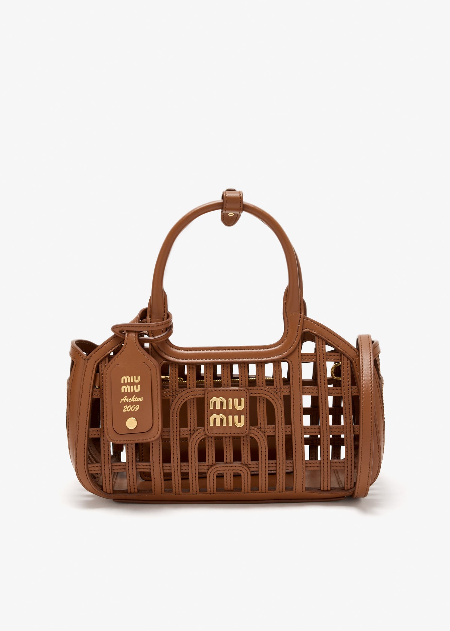 Defined by a chic woven motif, this soft nappa leather basket channels a warm summer sensibility while reflecting the polished elegance of the Miu Miu collection. Its open basket‑weave design is paired with a detachable, adjustable leather shoulder strap and removable charm, finished with gold‑tone hardware and metal lettering on the front.