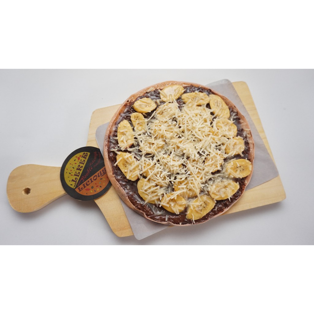 Leker dengan toping coklat+pisang+keju emmberikan sensari manis dan gurih dengan diameter 20 cm.
