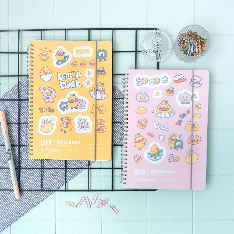 Setiap buku tulis seri Lemon Duck ini datang dengan stikernya masing-masing. Artinya, sembari kamu mencatat, kamu bisa memilih stiker yang kamu mau dari halaman depan atau belakang untuk ditempel menghiasi tulisanmu. Tidak hanya itu, tiap buku dilengkapi karet pengikat dan sampul luar berbahan plastik tebal agar bentuknya kokoh dan isinya terlindung dari basah dan debu.
