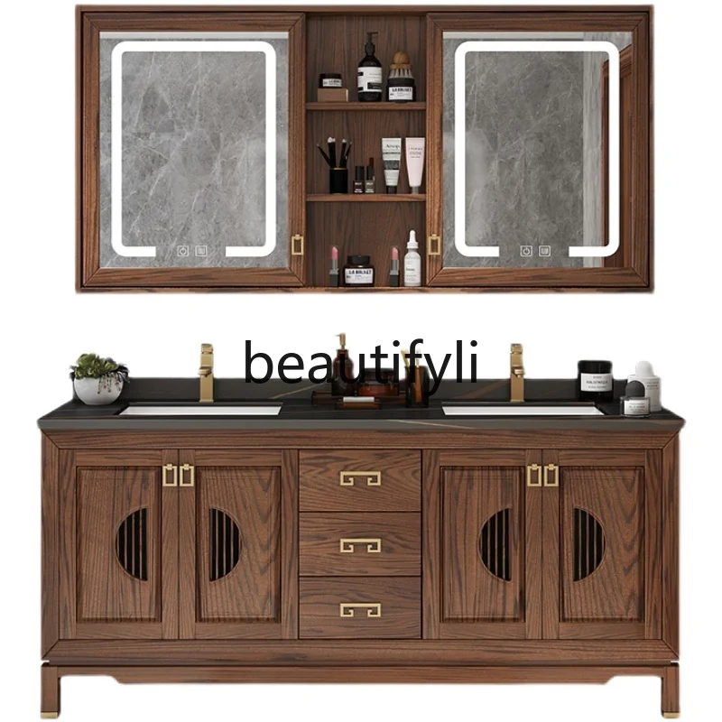 New Chinese red oak bathroom cabinet Solid wood smart mirror bathroom cabinet Toilet floor washbasin cabinet