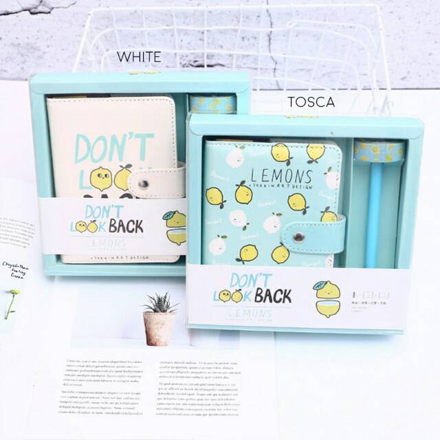 Sampul buku berbahan kulit bertekstur halus yang bisa dibuka tutup dengan kancing. Pola buah lemon yang lucu tersedia dalam 2 warna: toska dan putih, tampak cerah setiap hari.