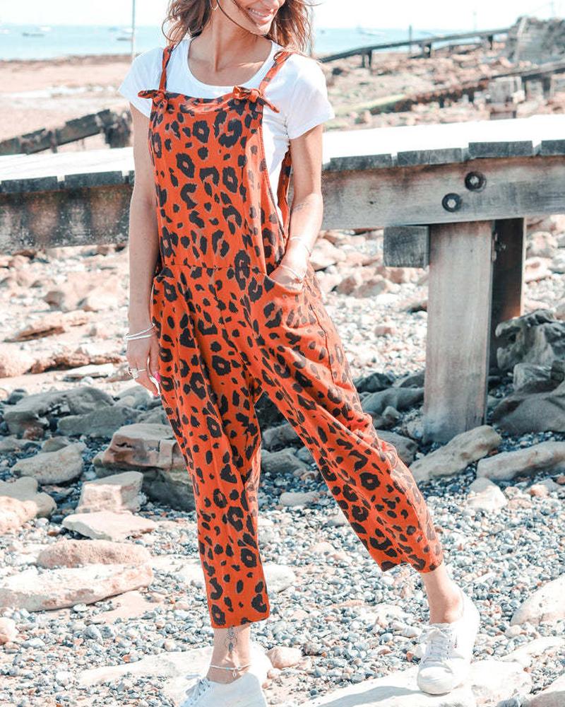 Leopard Print Sleeveless Pocket Design Jumpsuit, Orange
