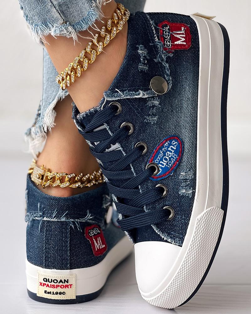 Letter Pattern Ripped Lace-up Sneakers, Dark blue