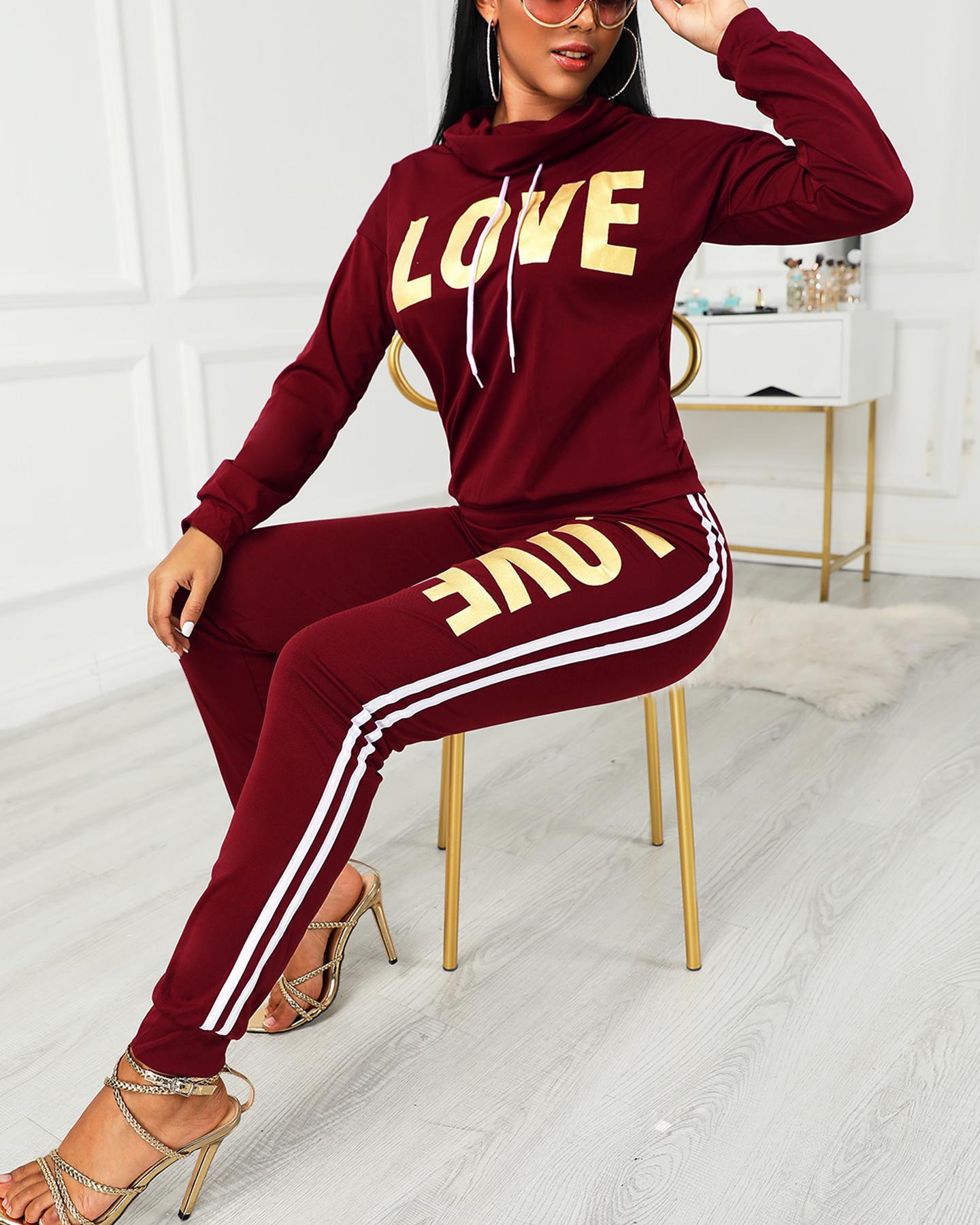 Letter Print Heap Neck Top & Striped Tape Pants Set, Red