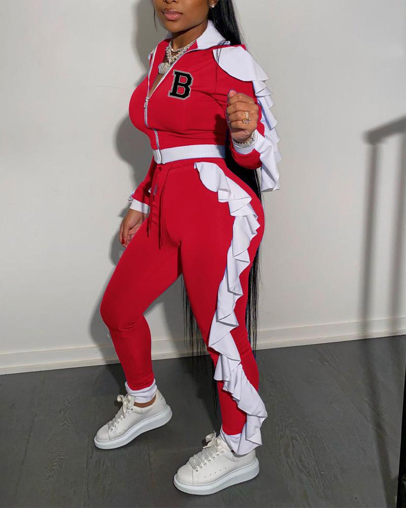 Letter Print Ruffle Hem Zip Up Top & Drawstring Pants Set, Red