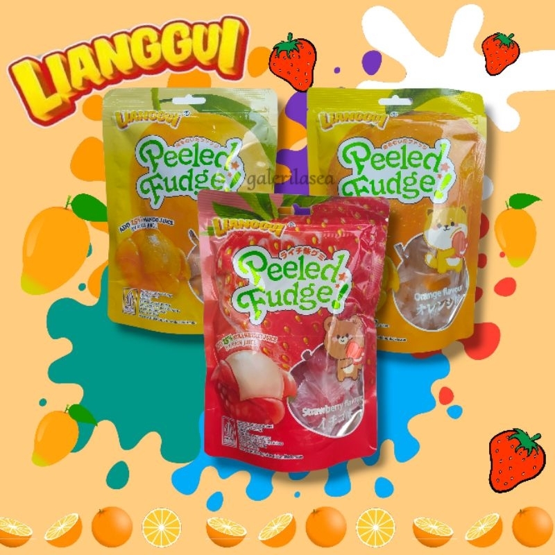 Lianggui Peeled Fudge adalah varian permen jelly atau gummy yang memiliki rasa mangga, jeruk, strawberry dan memiliki ukuran yang kecil atau mini. Permen ini terbuat dari gelatin, gula, air, dan bahan-bahan lain yang memberikan tekstur kenyal dan rasa yang mirip dengan buah.