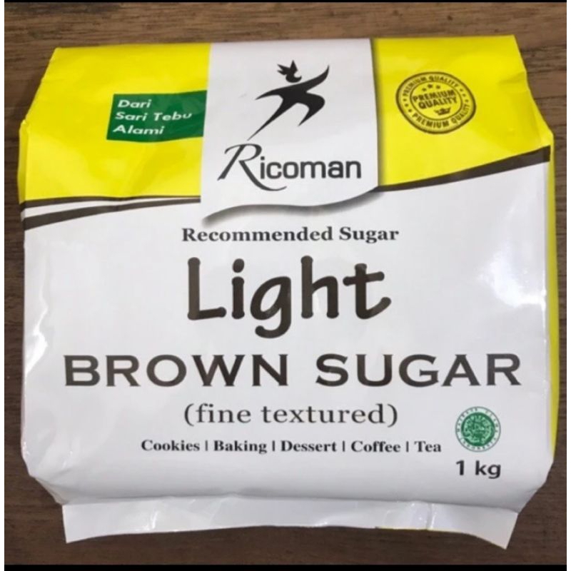 Ricoman light brown sugar adalah standart brown sugar yang ada di dalam resep. Terbuat dari sari tebu alami. Memiliki tekstur yang lembut, wangi khas brown sugar, dan rasa karamel yang soft. Rasa yang dimiliki akan lebih soft jika dibandingkan dengan Ricoman Dark Brown Sugar.