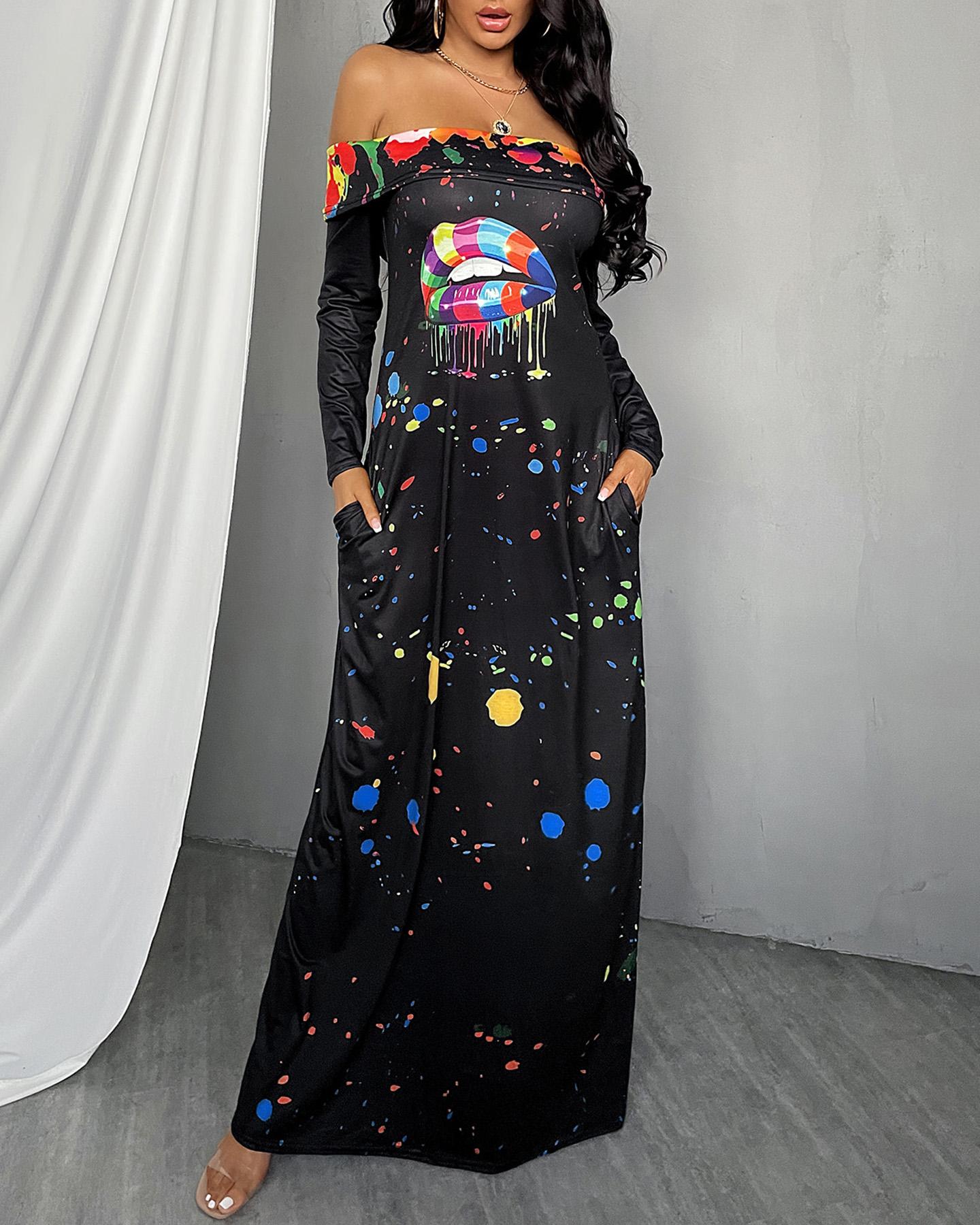 Lip Letter Print Ink Splash Off Shoulder Maxi Dress, Style2