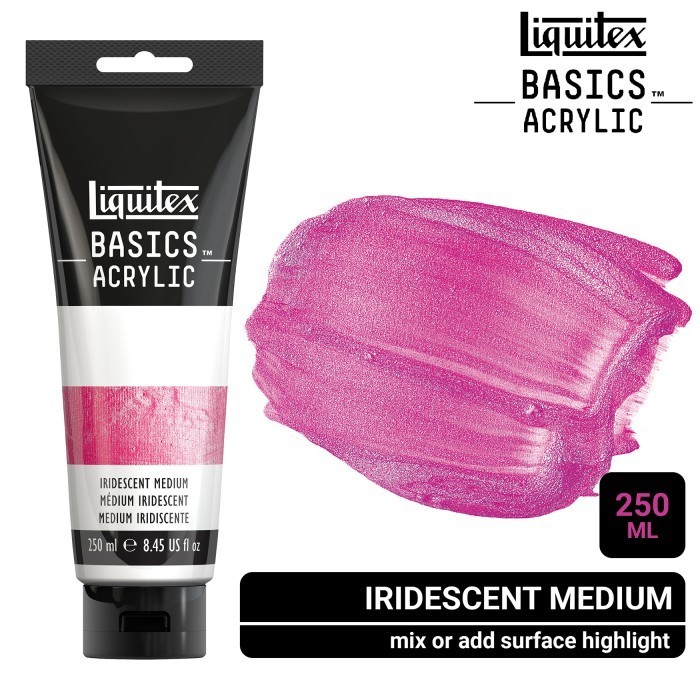 Liquitex Basics Iridescent Acrylic Medium adalah media campuran cat acrylic yang memberikan sentuhan iridescent (berkilauan seperti pelangi) pada cat akrilik. Cocok untuk pemula hingga professional, dapat dicampur dengan cat untuk menciptakan efek kilau yang halus dan elegan, atau digunakan secara langsung sebagai lapisan atas untuk menambahkan highlight yang memukau.