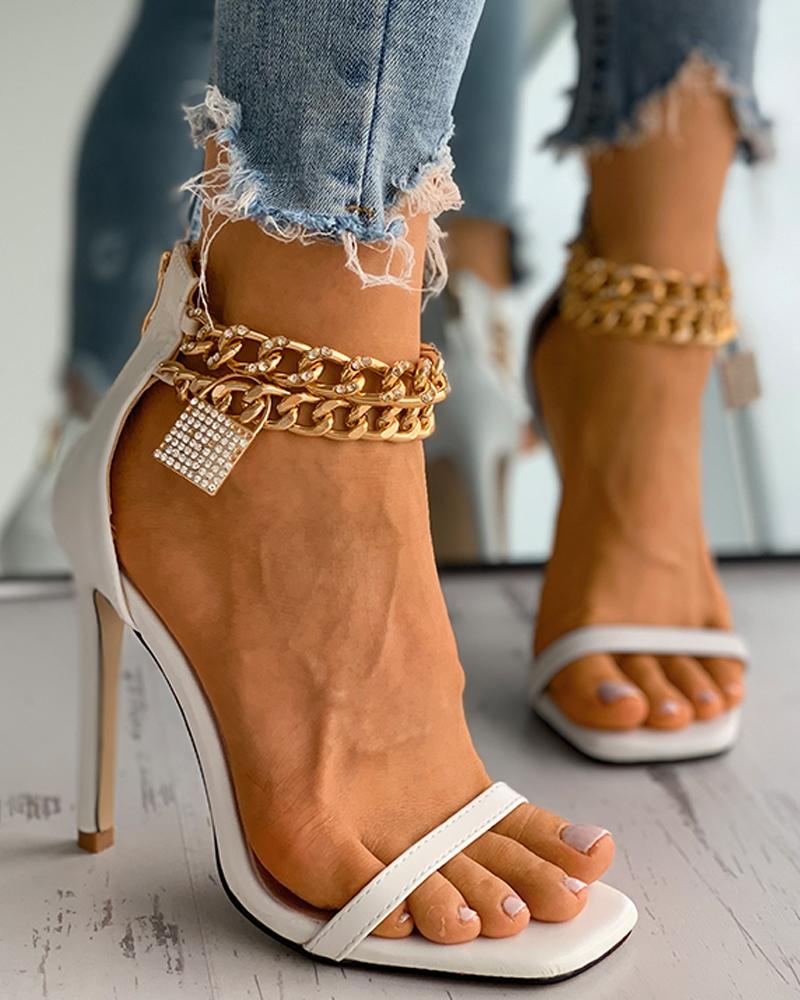 Lock Pattern Rhinestone Chain Strap Stiletto Heels, White