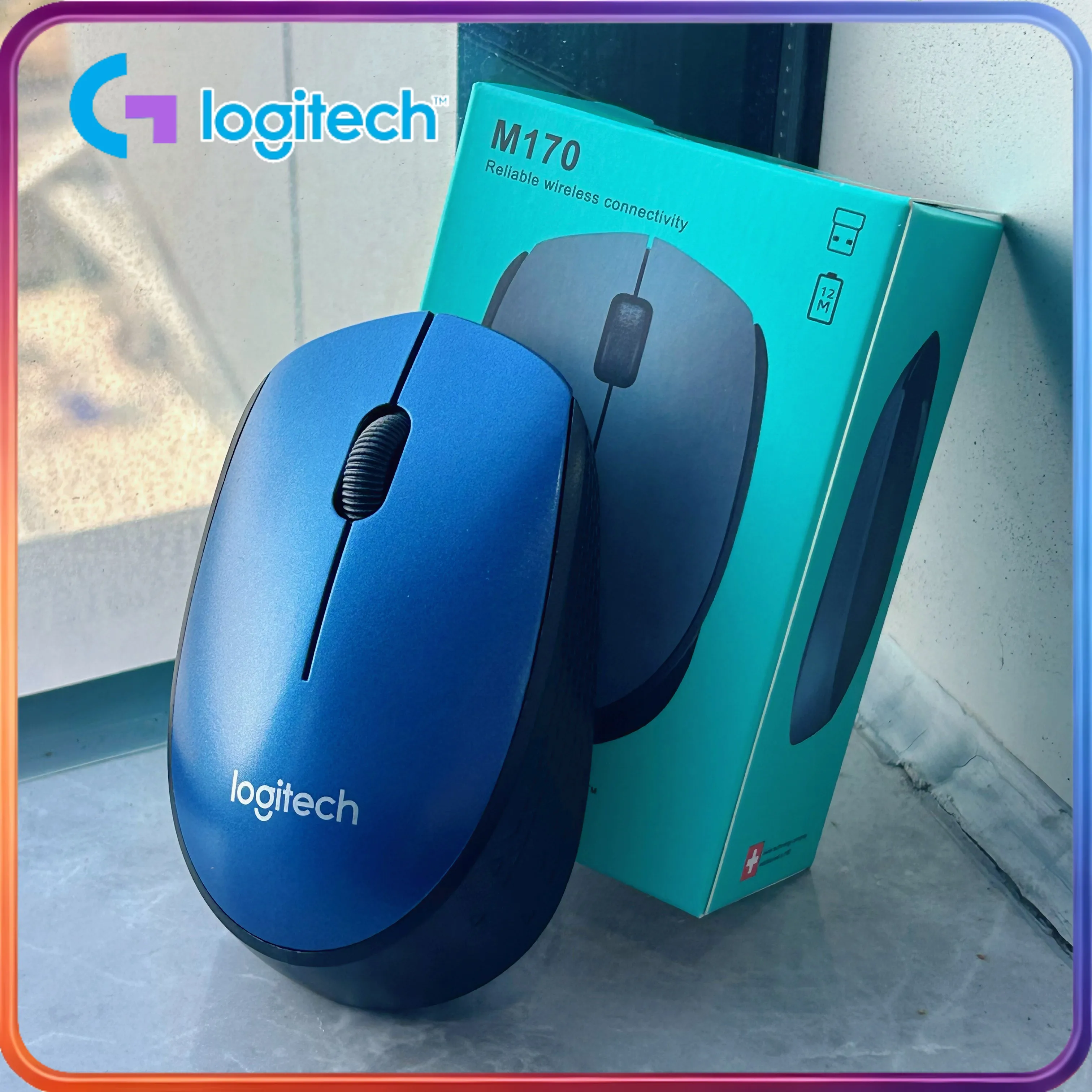 Logitech M170 Wireless Optical Mouse with USB receiver, 10-meter transmission range, suitable for office and study use.