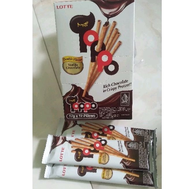 Toppo Snack Biskuit Stik Pretzel Rasa Cokelat dengan 2 varian rasa Vanilla Chocolate dan Cocoa Chocolate. 1 pack isi 12pcs