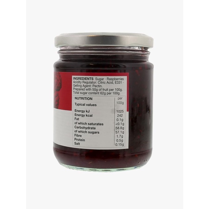 Ingredients : Sugar · Raspberries · Acidity Regulator: Citric Acid, E331 · Gelling Agent: Pectin. Prepared with 50g of fruit per 100g. Total sugar content 62g per 100g. Sugar: traded in compliance with Fairtrade Standards, minimum 50%.