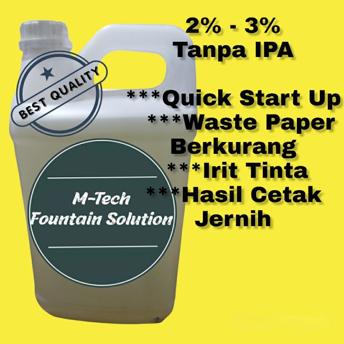 M Tech Fountain Solution adalah cairan yang berfungsi untuk membasahi bidang non image dan membuat plate tahan terhadap tinta cetak pada mesin offset. Disupport of PT Fujifilm Corp di Jepang.
