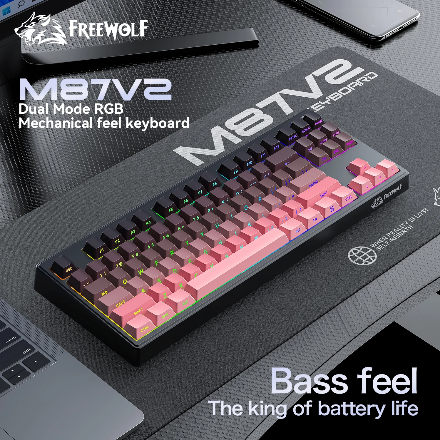 M87V2 87-key Wireless Keyboard ,RGB lighting effect, 2.4G Bluetooth Tri-mode Connectivity, Multi-function Suitable for Computer