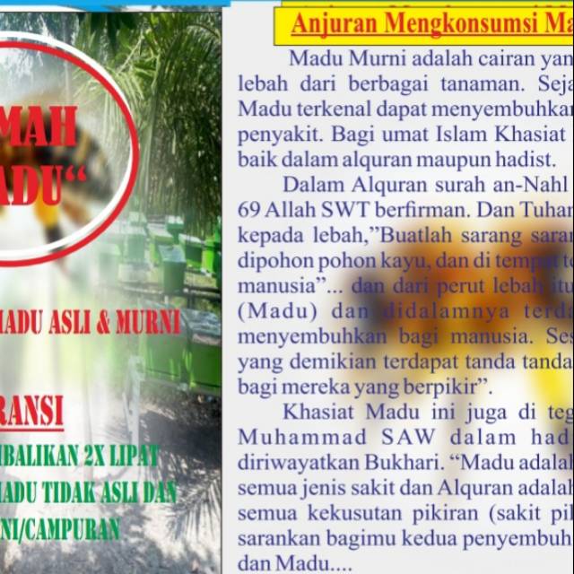 Kami menjual madu asli dan murni. Kami berani garansi dengan mengganti 2x lipat bila madu tidak asli. Karena kami menyadari bahwa kepuasaan konsumen adalah kunci usaha lancar. Kami menyadari juga bahwa kita membeli madu yg murni dan asli adalah untuk kesehatan,,suatu dosa besar bagi kami bila madu yg kami jual sudah tidak asli dan dicampur, karena bukan sehat mengkonsumsi madu tapi malah sebaliknya bisa menjadi penyakit. Untuk itu kami berani garansi dunia akhirat keaslian dan kemurnian madu yang kami jual.
