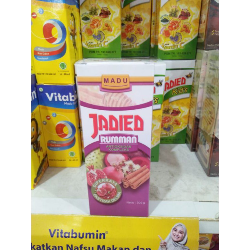 MADU JADIED RUMMAN plus ekstrak buah delima Madu Jadied Rumman antioksidan kompleks adalah madu yang diperkaya aneka herbal pilihan yang telah terbukti khasiatnya. Madu jadied rumman terbuat dari madu pilihan yang diformulasikan dengan ekstrak manggis, buah delima, sirsak, cengkeh, kayu manis dan propolis. Kombinasi tepat bahan-bahan berkhasiat.