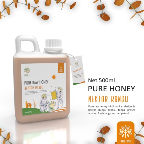 Madu Tava Raw Honey sangat murni dan fresh tanpa campuran zat lain dengan kualitas terbaik karena langsung dari petani indonesia yang teredukasi dalam menangani proses ternak lebah.Tersebar dari berbagai petani indonesia dilahan yang kaya akan nektar bunga. Panen secara berkala menjadikannya selalu fresh saat sampai ke tangan pembeli