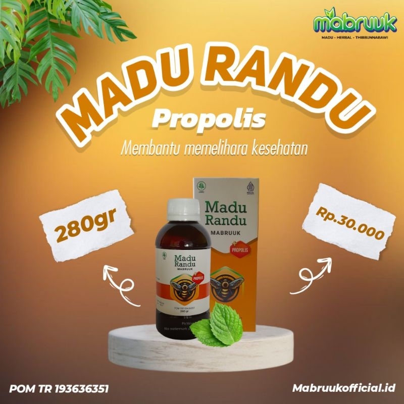 Madu Randu Mabruuk + Propolis adalah produk madu berkualitas tinggi yang menggabungkan kebaikan madu randu murni dengan khasiat propolis. Madu ini dikemas dalam kotak menarik dengan desain yang menonjolkan lebah madu, simbol kemurnian dan alam.