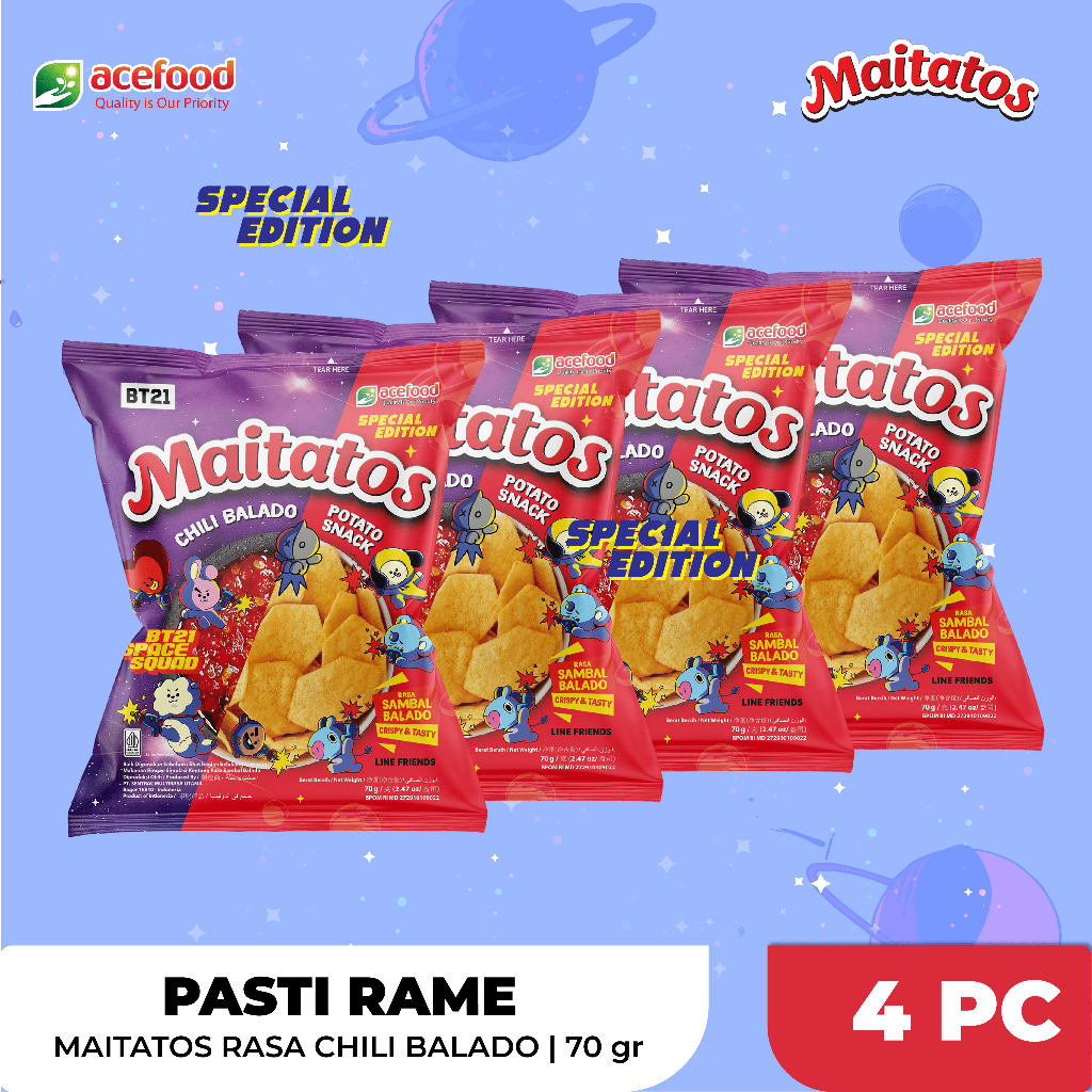 MAITATOS Potato Snack SPECIAL EDITION BT21 adalah Chips kentang dengan rasa khas Sambal balado yang dikemas dengan karakter2 BT21 favoritmu, cocok menemanimu di kala santai